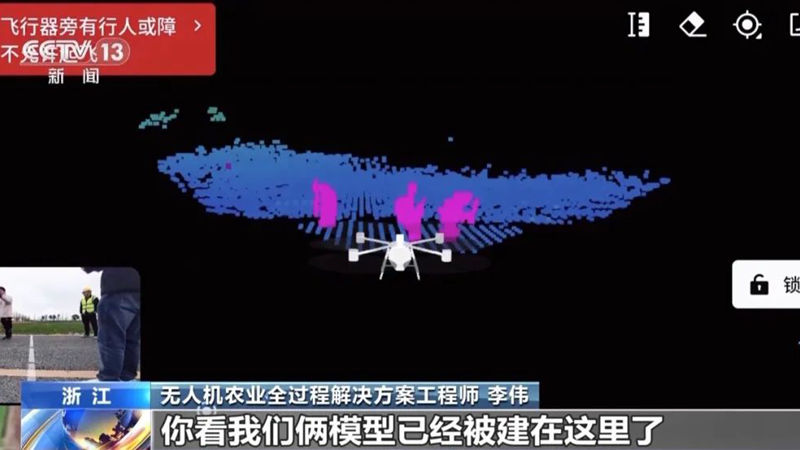 無人機農(nóng)業(yè)全過程解決方案工程師 李偉:說話的頃刻間,我們倆的模型已經(jīng)被建在這里了,后邊的農(nóng)田,模型已經(jīng)在這里建成了。